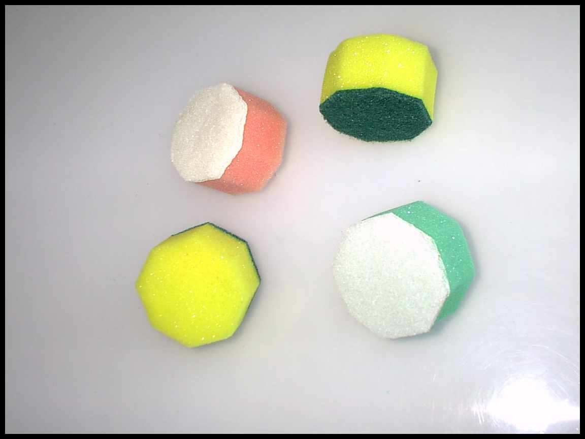 Octagonal Useful to wash ceramic.Colors: Green Scouring Pad-Yellow Sponge, White Scouring Pad-Pink Sponge Sizes: 6.4x6.4x4 |